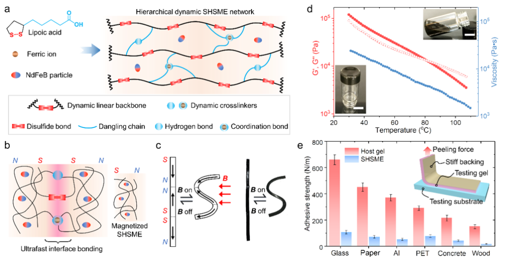 在SHSME材料设计中,利用生物小分子硫辛酸作为聚合物网络基本单元,NdFeB微颗粒作为磁性分散单元。SHSME含有大量的二硫键、氢键以及金属-配体键等动态键合,因此在材料损伤界面存在丰富的未配对动态键合,这些悬挂的未配对键可以通过非常规扩散作用重新结合从而实现材料的自发修复。