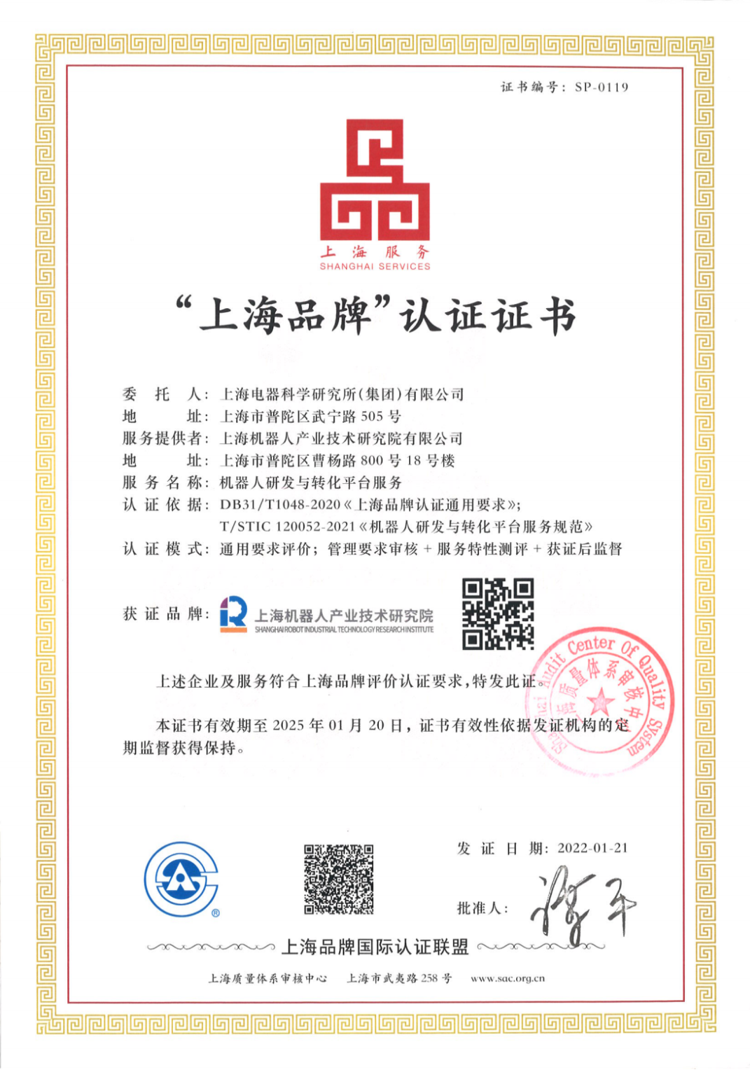 近日,机器人功能型平台“研发与转化服务”获“上海品牌”认证。