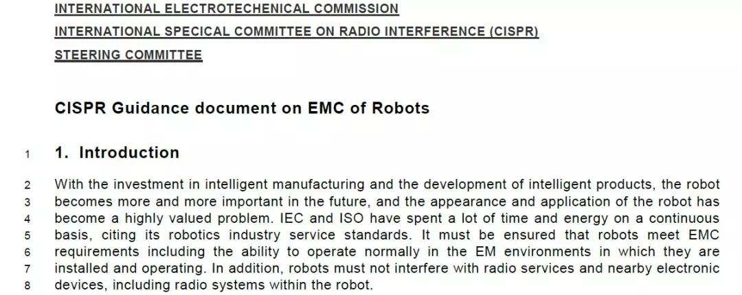2018年9月14号,IEC/CISPR发布首个机器人电磁兼容最高指导文件《Guidance document on EMC of robots》,该文件由机器人功能型平台技术专家参与主导制定。