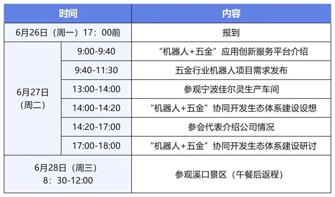 加快推进五金行业机器人项目、产业链内循环及生态体系建设,促进“机器人+五金”从应用需求到供应链需求一体化协同发展,电科云汇机器人应用创新服务平台拟定于2023年6月26日至6月28日在宁波佳尔灵气动机械有限公司召开五金行业机器人项目需求发布暨“机器人+五金”协同开发生态体系建设研讨会。拟发布35项五金行业机器人需求项目,并就协同开发生态体系与行业优质企业达成内循环多循环战略,进行端到端服务,不仅适应当下商业发展的规律和特点,也符合未来的经济格局和发展需求。现将有关事项通知如下: