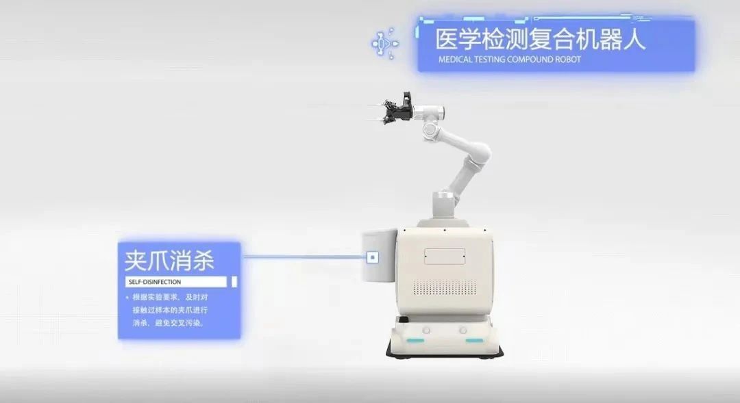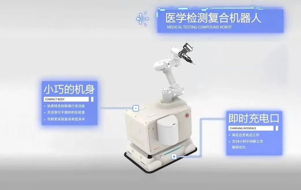 目前已为上海宏滩生物科技有限公司开发了一套全向移动复合机器人系统,采用移动AGV+机械臂的形式,在实验室内进行自动化的检测上下料等工艺流程,实现无值守医学检测实验室的自动化流程搭建。